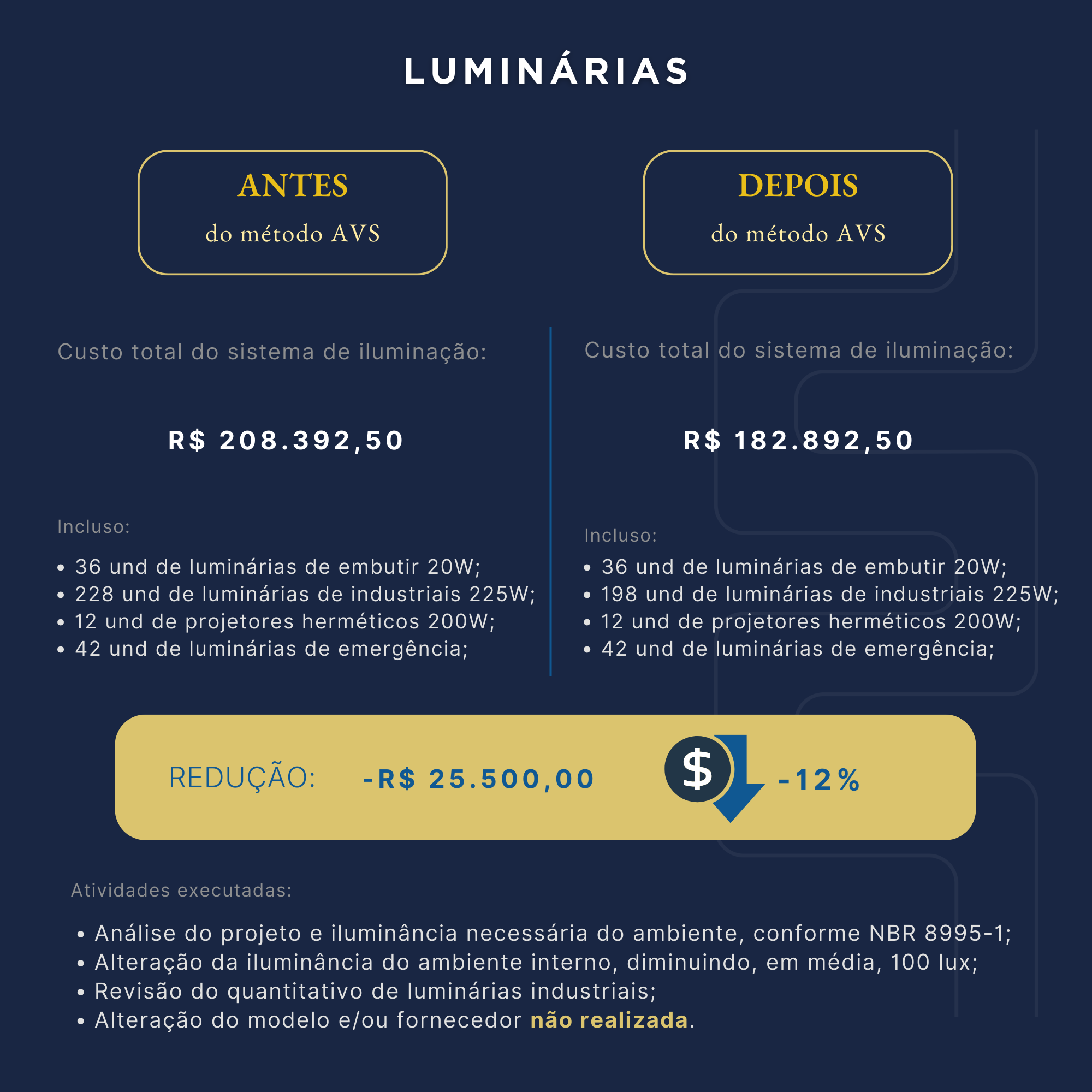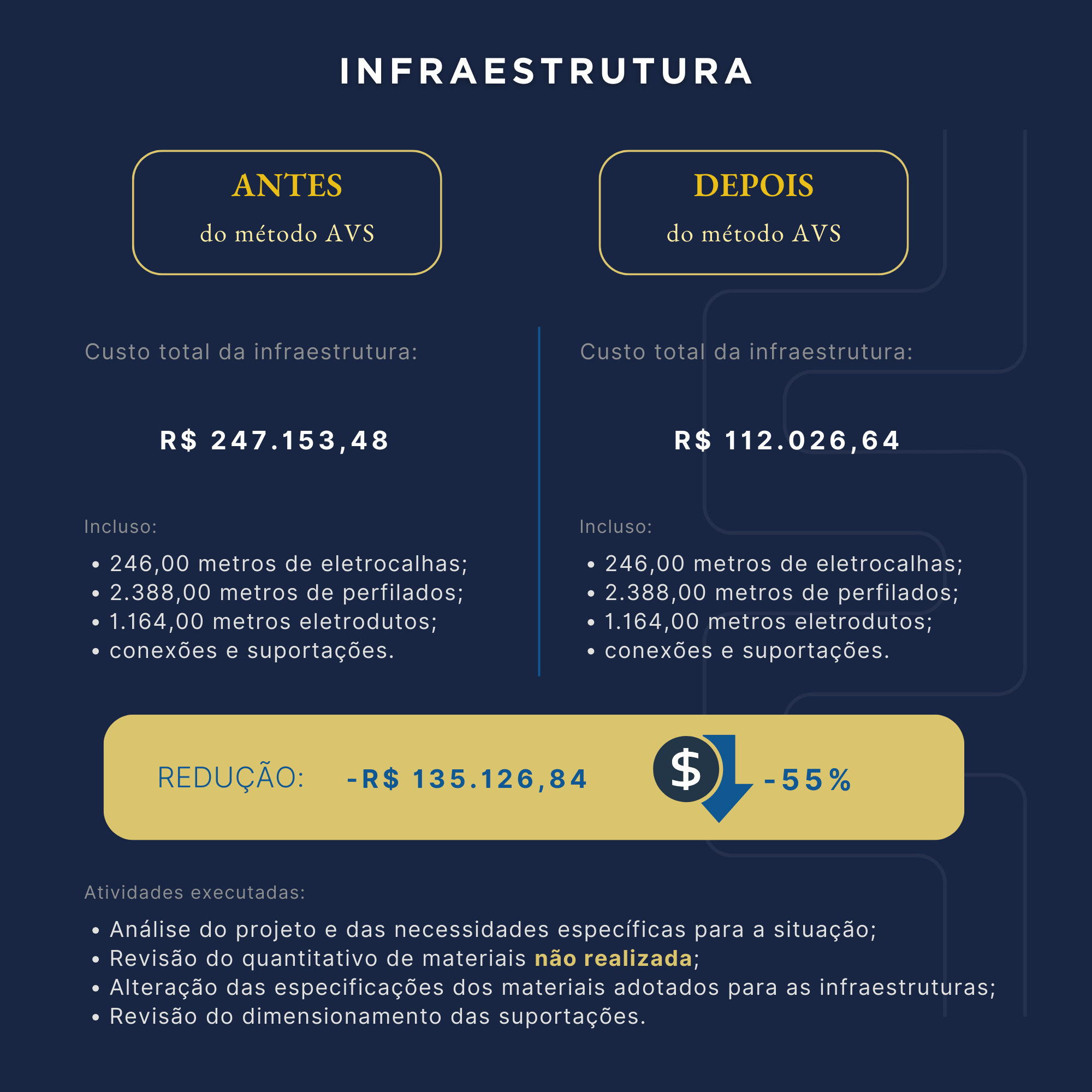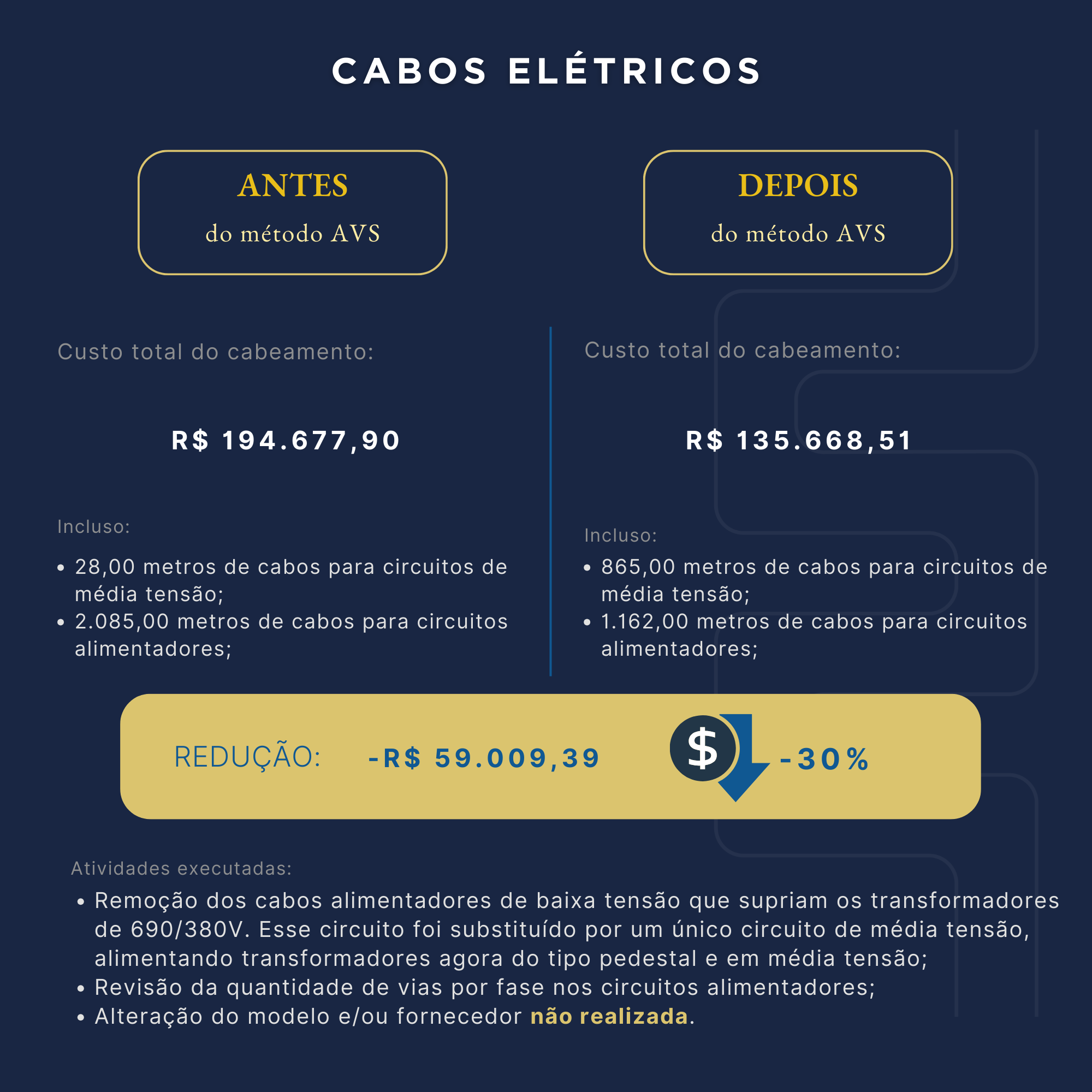 Confira abaixo soluções de instalações elétricas otimizadas com a metodologia AVS, resultando em economias expressivas para as instalações.